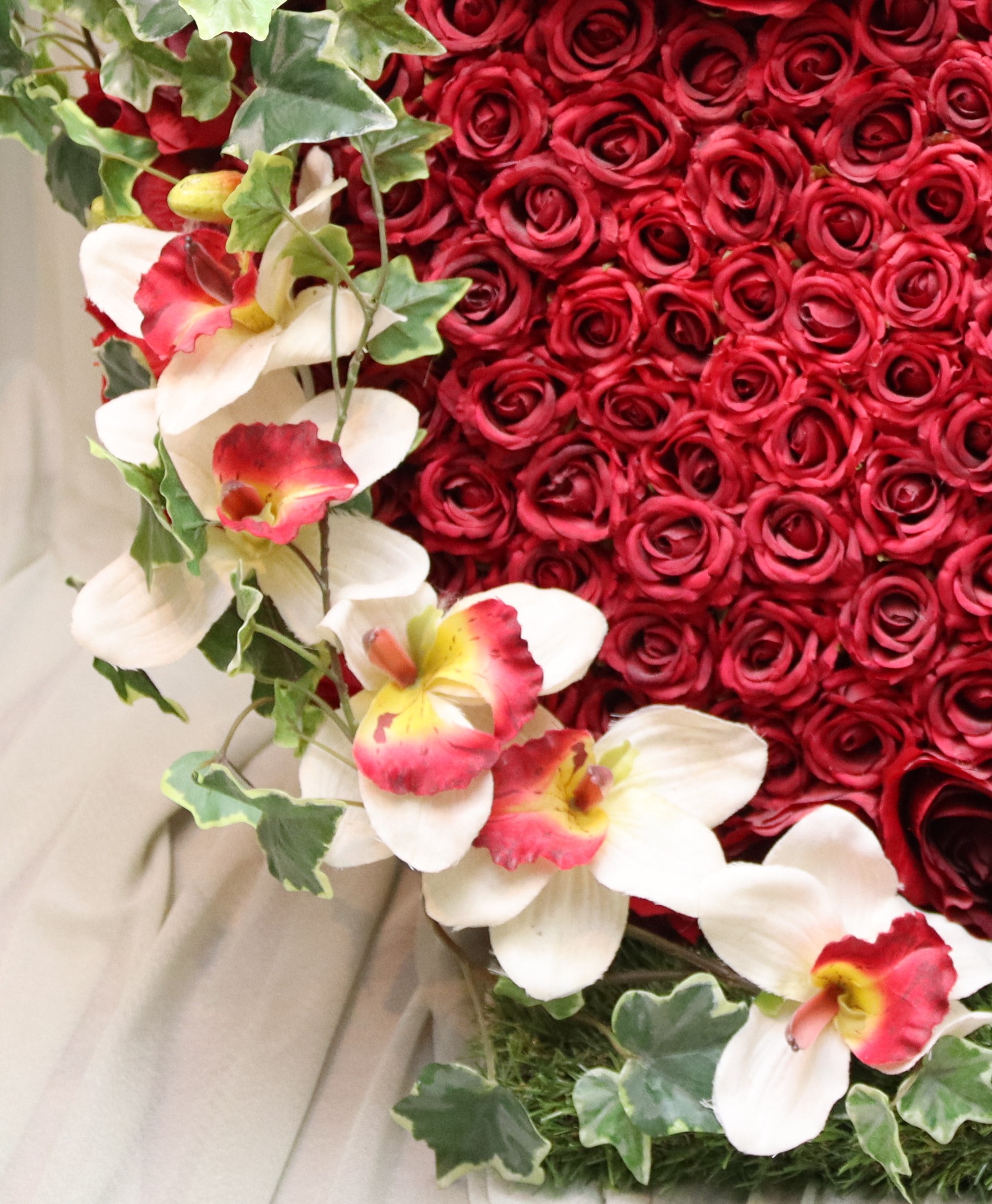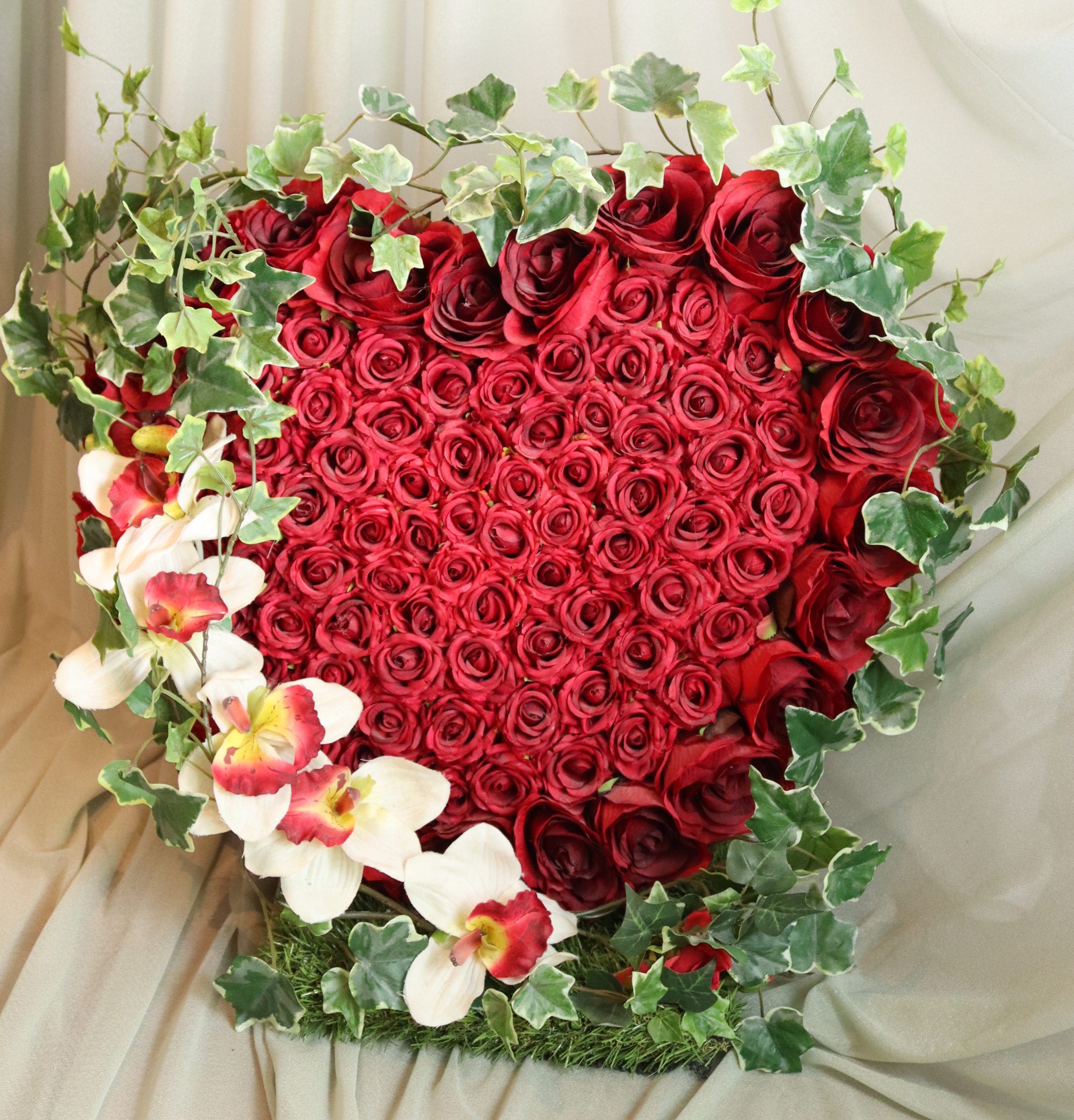 A contemporary heart-shaped tribute, handcrafted from massed red roses to create a bold and striking focal point. The design is beautifully adorned with a delicate spray of Cattleya orchids, surrounded with trailing Hedra Glacier ivy for elegance and natural texture.