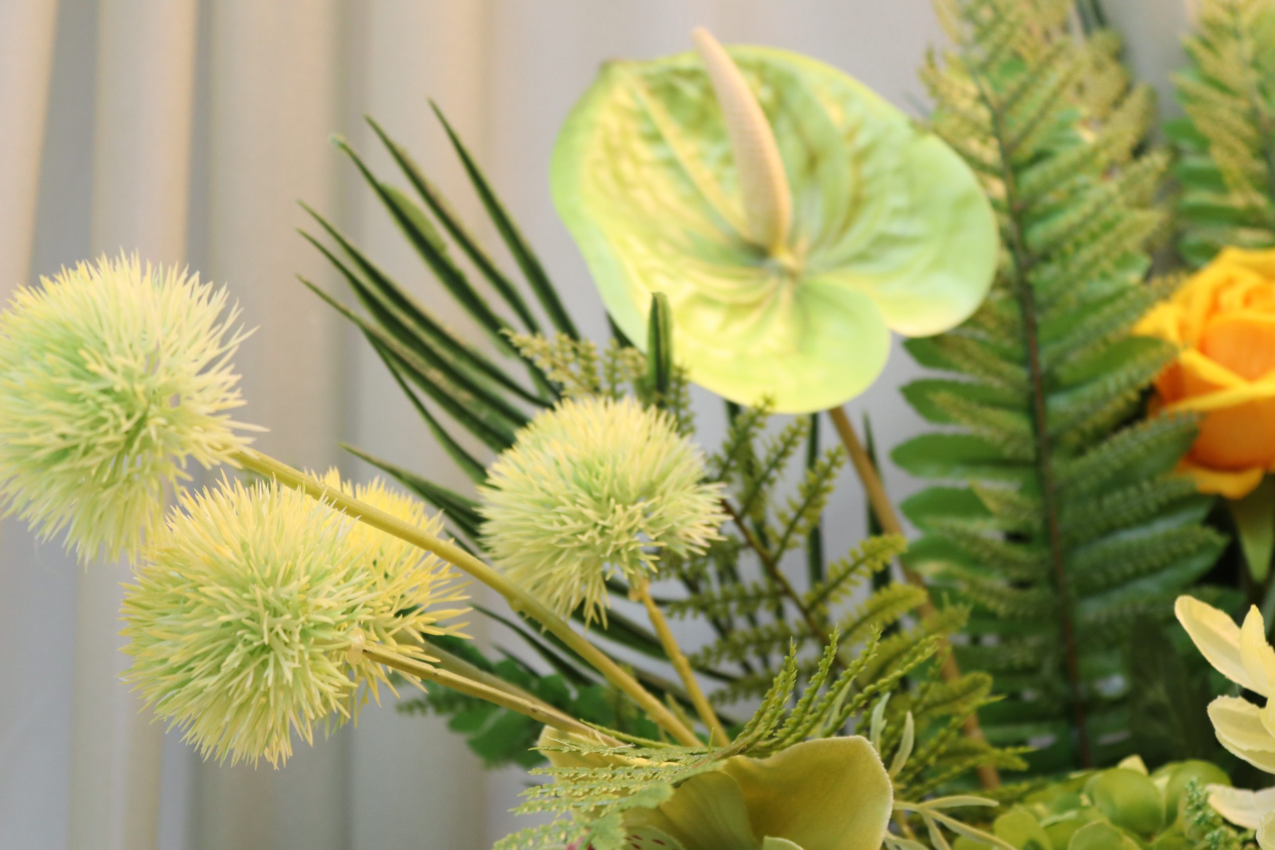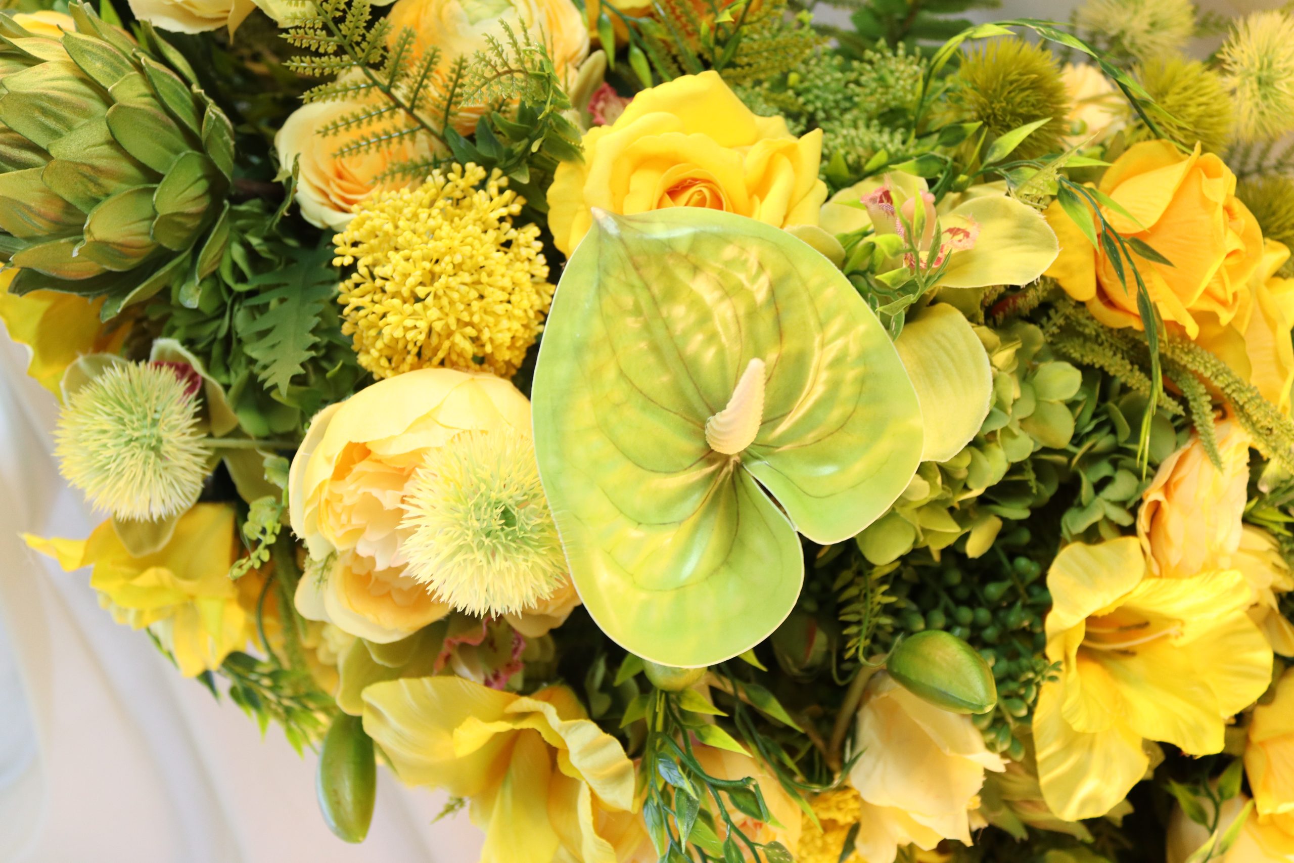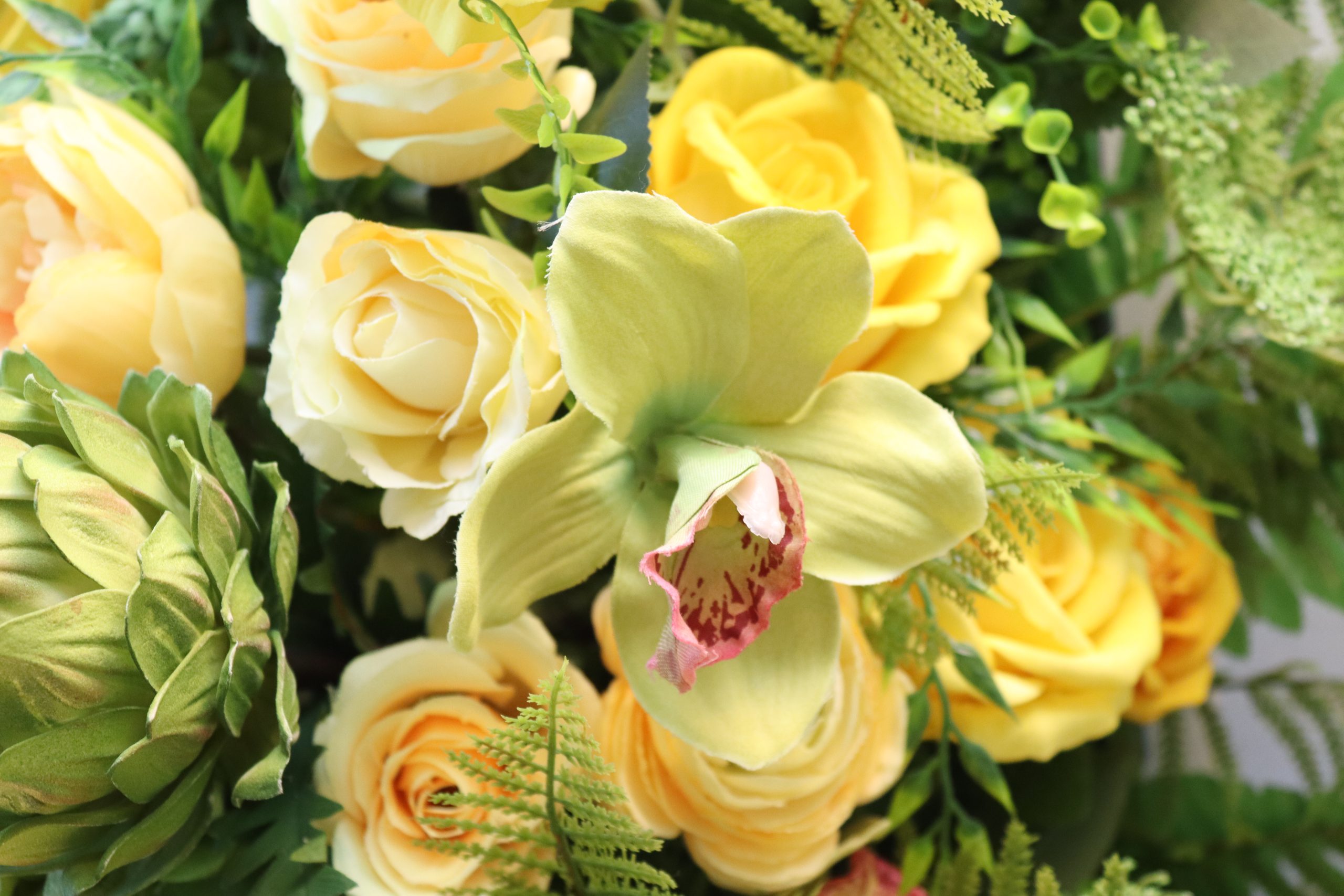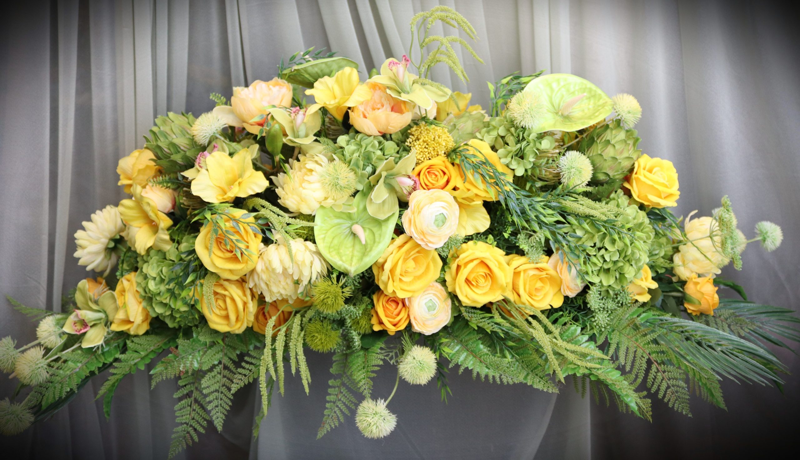 A radiant and uplifting tribute, the yellow rose and orchid casket spray feature a cheerful blend of bright yellow roses, green cattleya orchids, and light-yellow dahlias, delicately complemented by soft yellow roses, elegant pampas grass heads, weeping willow sprigs and the unique touch of the pineapple flower.
