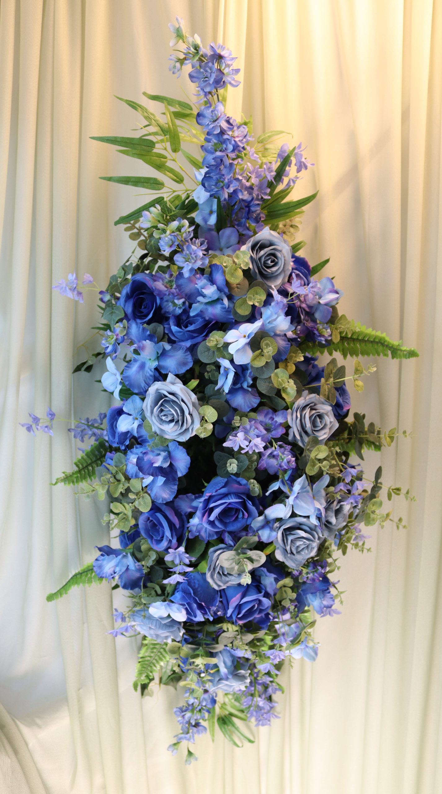 An elegant spray of blue roses, iris, hydrangea, and lush foliage. Handcrafted, foam-free, and sustainable for a heartfelt, eco-conscious farewell.