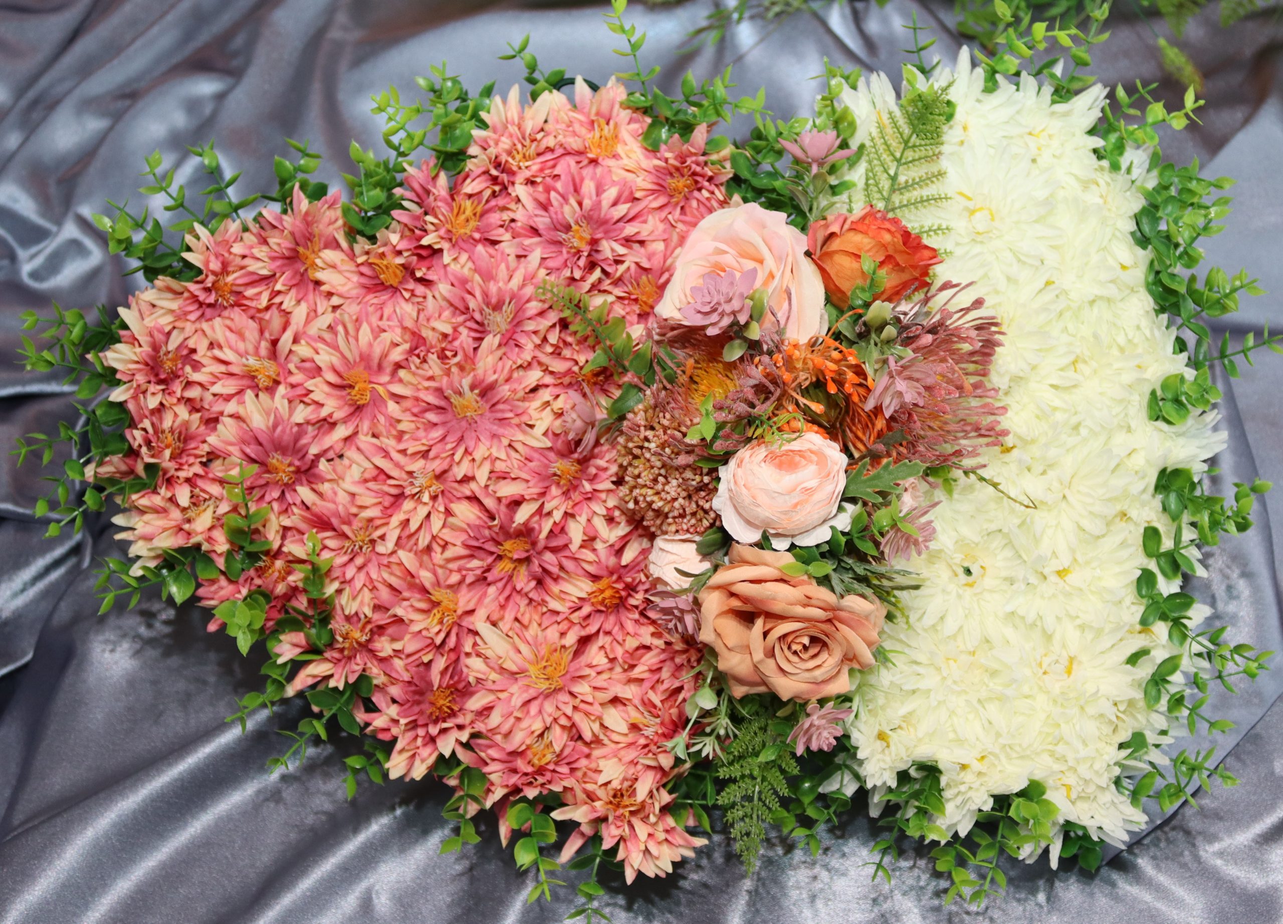 A touching and symbolic tribute, featuring two entwined hearts to represent everlasting love and connection. One heart is beautifully crafted from cream chrysanthemums, while the other is made from striking crab claw chrysanthemums, creating a harmonious contrast of soft and bold tones.