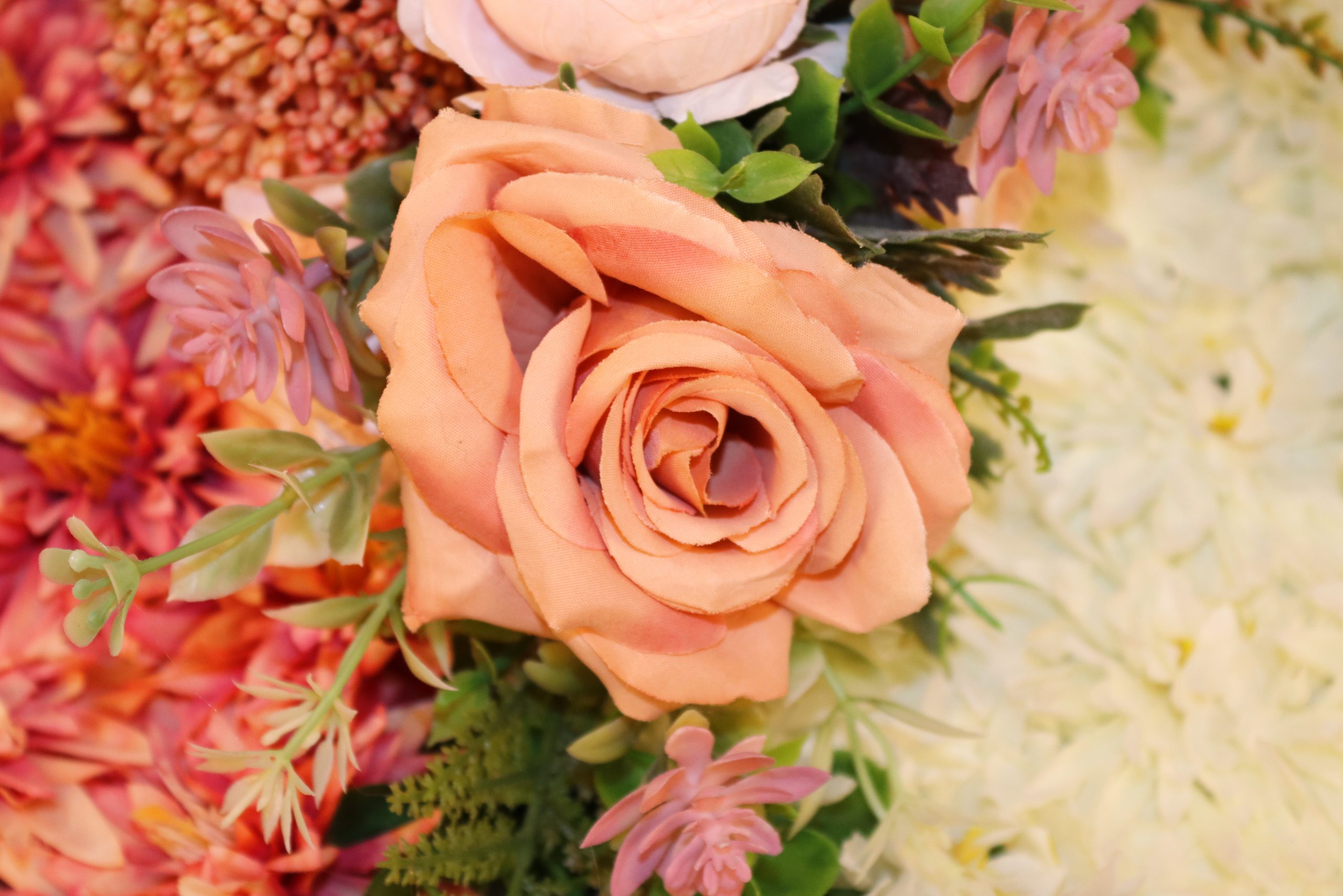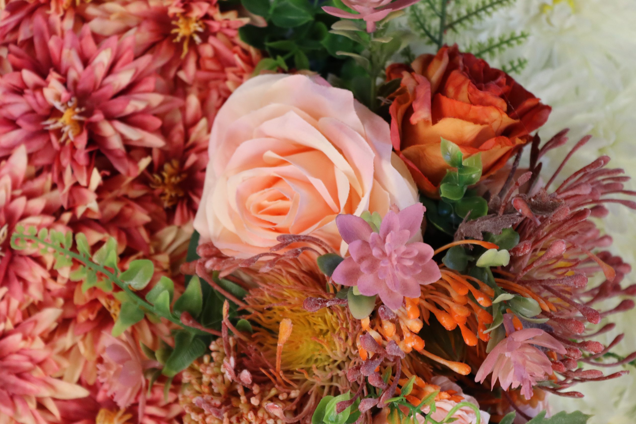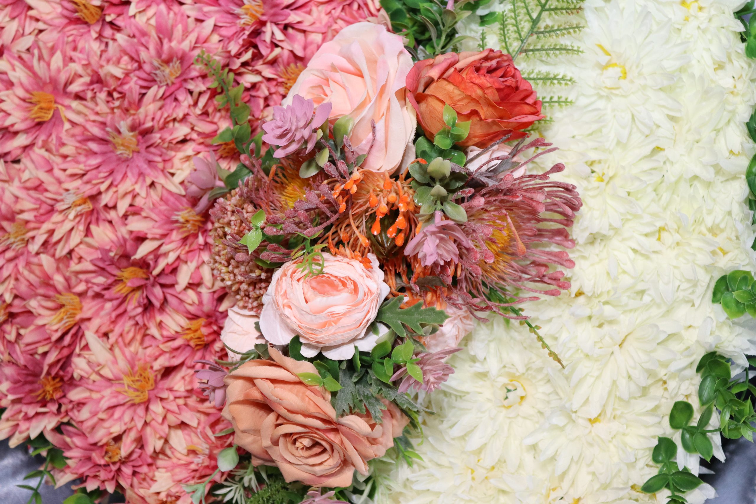 The design is complemented with a corsage of peach ranunculi’s, large tea roses, South African gladiolus, fern leaves, pink succulents, and Carissa leaf sprigs, adding texture, depth, and a natural elegance to the tribute.