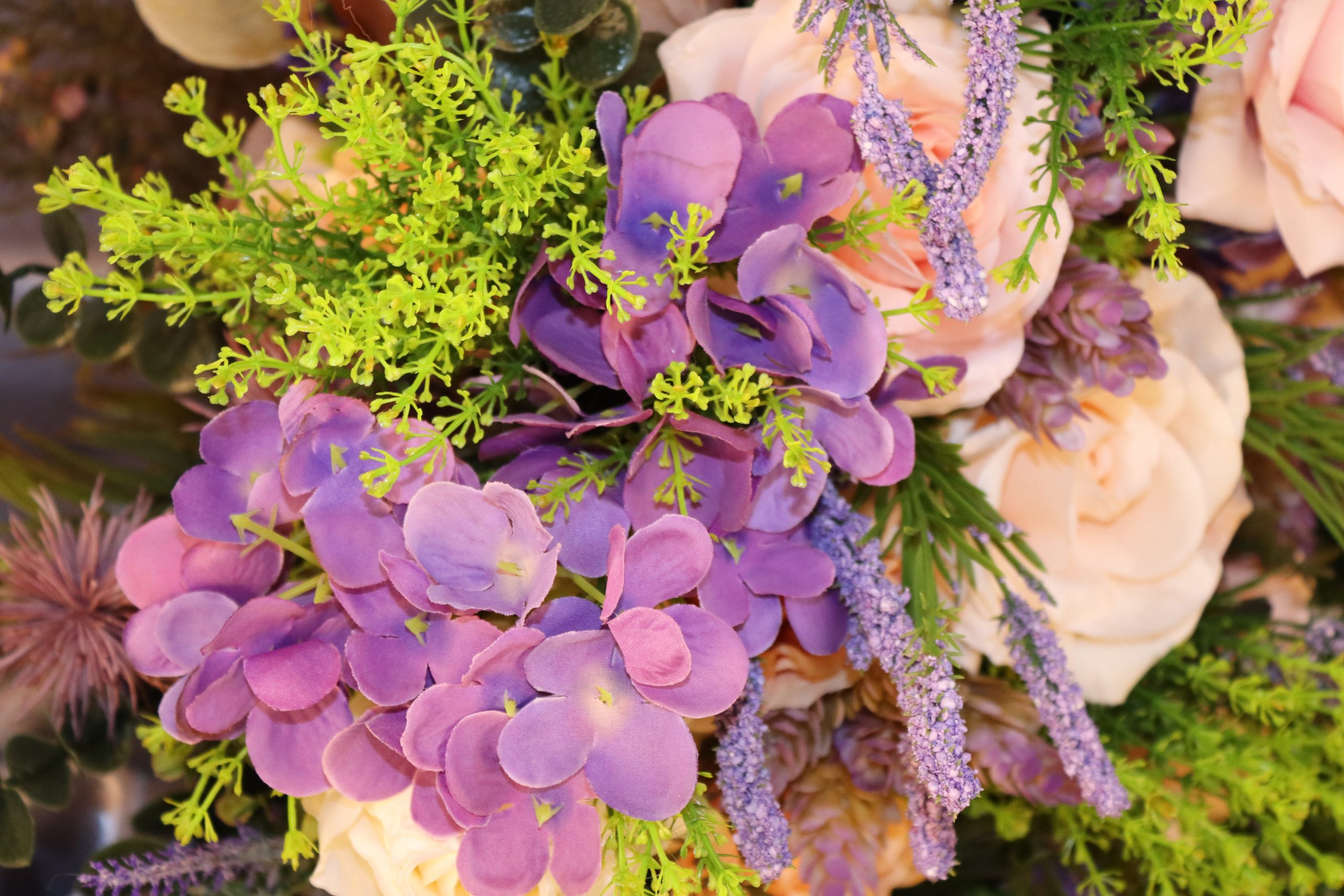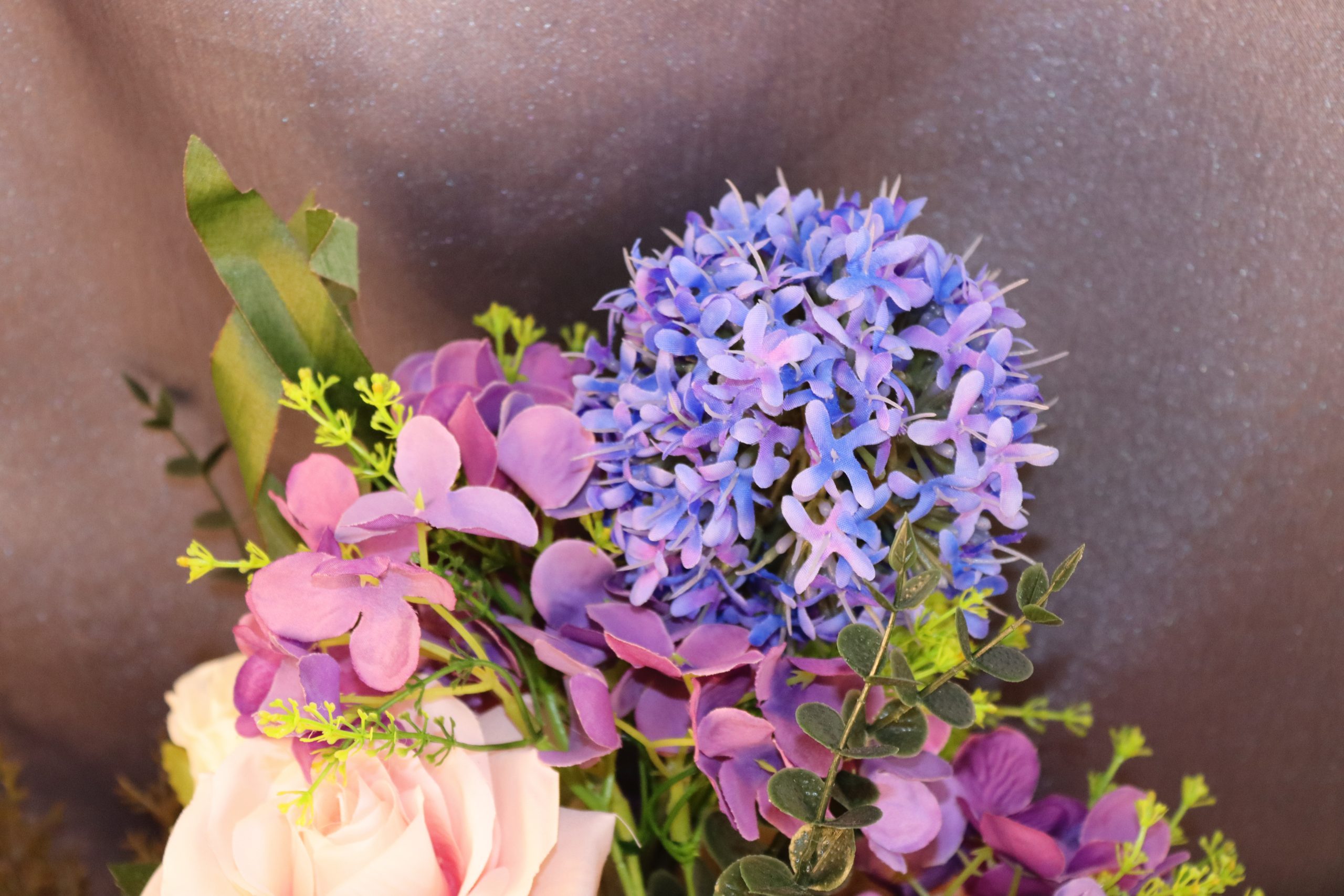 The arrangement is complemented with a sophisticated floral display of purple hydrangea heads, soft pink and peach roses, blue agapanthus snowball flowers, lavender sprigs, lilyturf, and eucalyptus stems, creating a harmonious and vibrant tribute that celebrates a passion for the game.