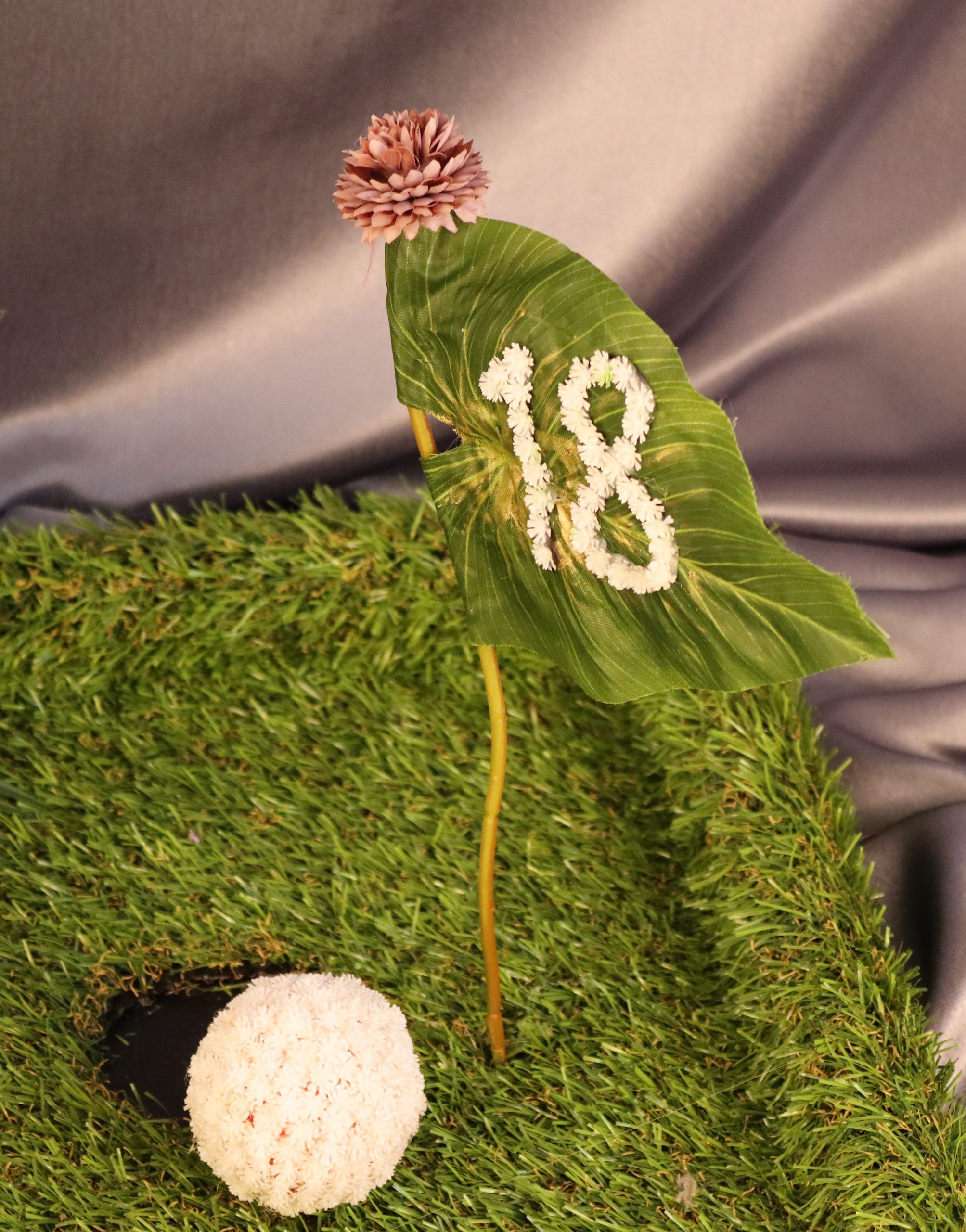 A unique and elegant 3D tribute for golf lovers, featuring a lifelike 18th hole golf ball crafted entirely from white gypsophila heads, resting on a bed of realistic artificial grass to recreate the feel of the putting green.