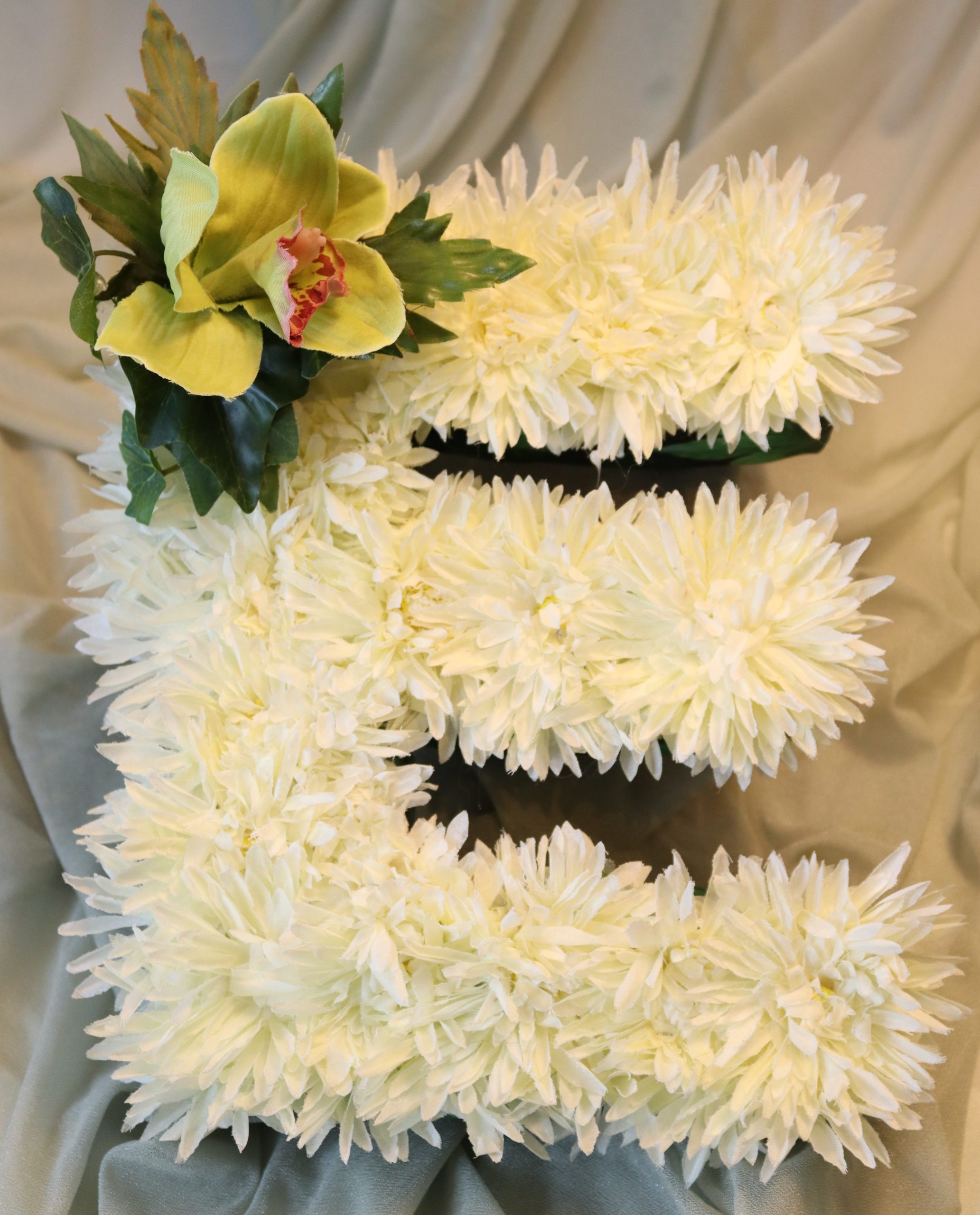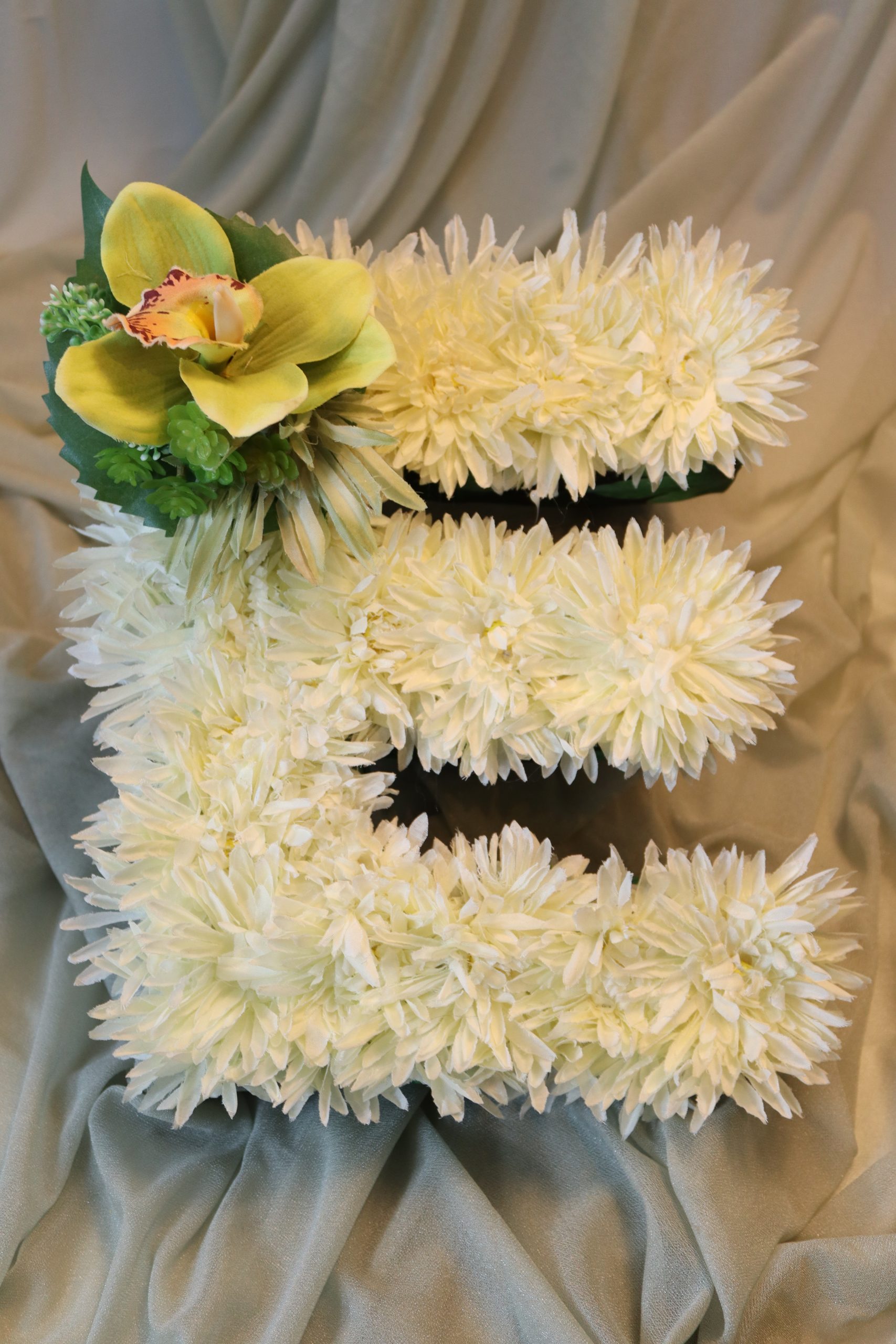 Handcrafted with care, this letter corsage perfectly complements the yellow rose and green tropical Flower casket spray, creating a coordinated and meaningful display.