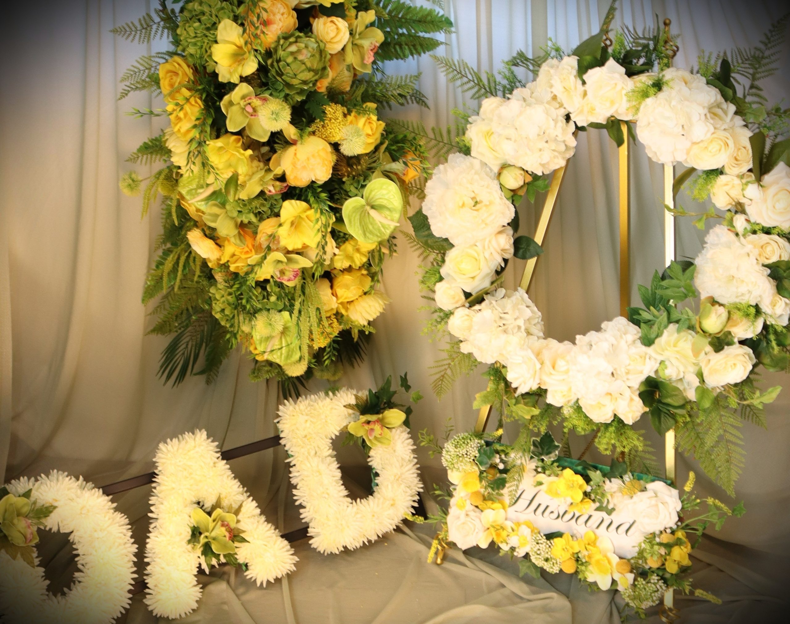 • Large Cream Peony Wreath – Soft cream peonies, ivory hydrangeas, and tea roses, edged with fern leaves, displayed on a gold easel.