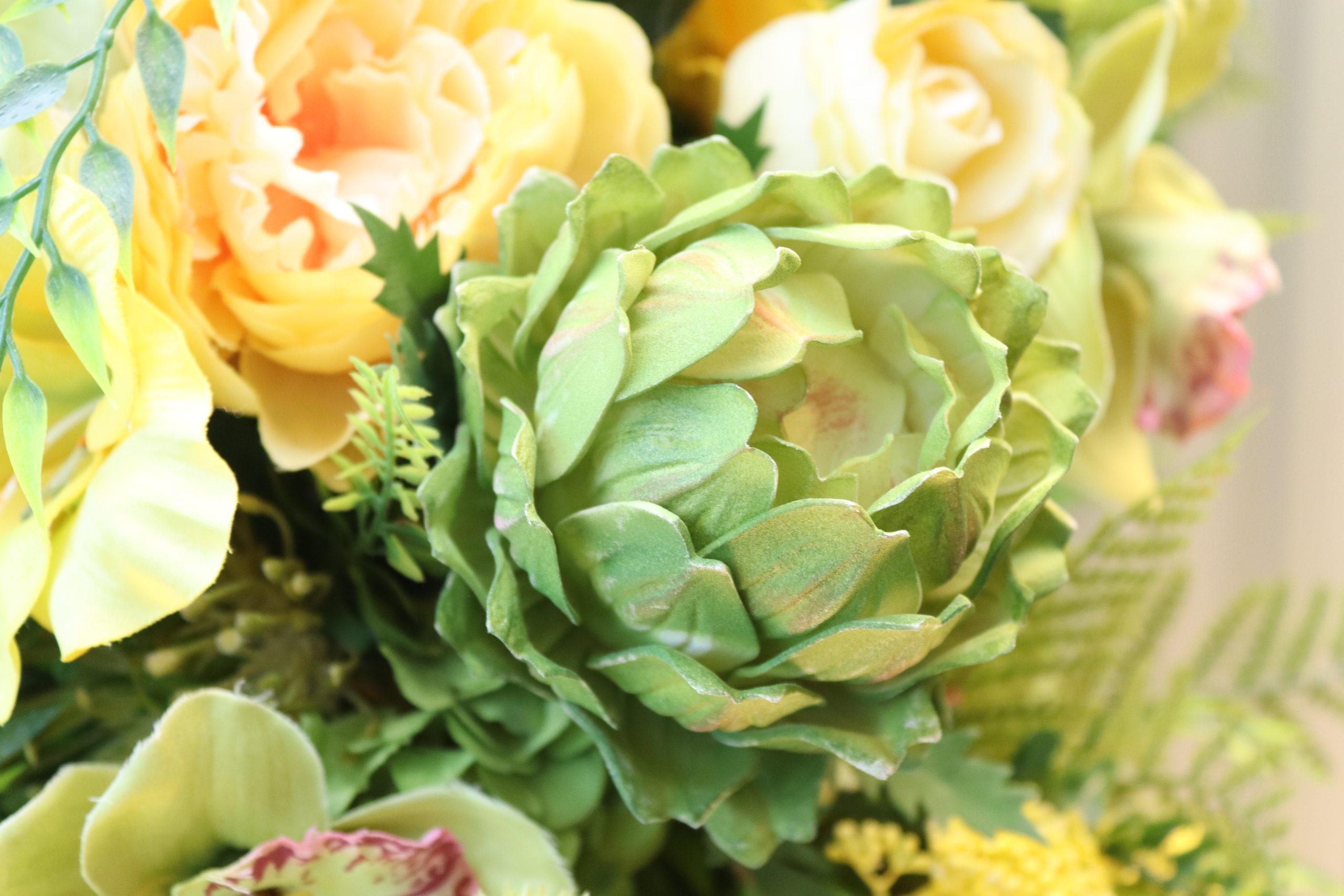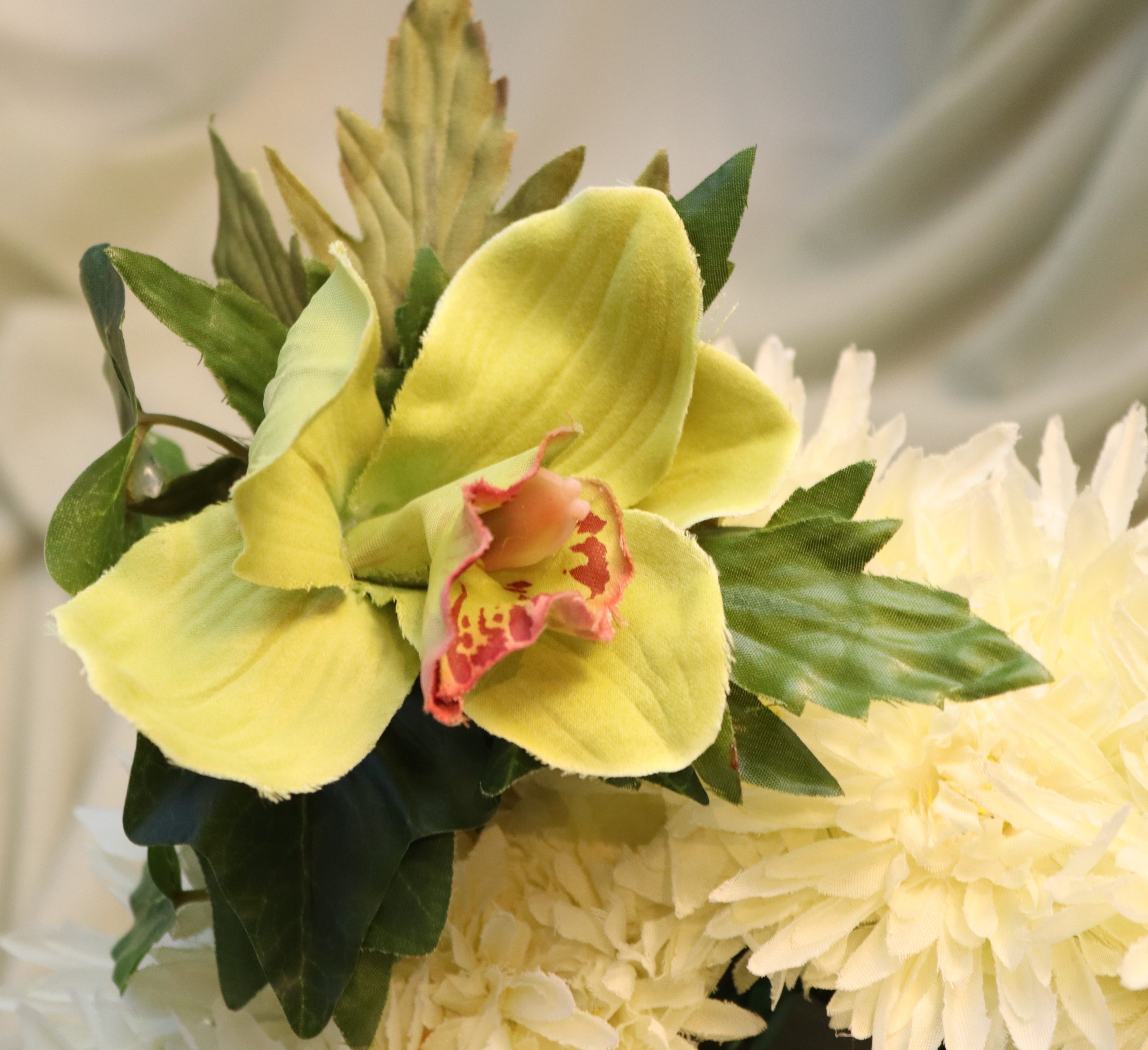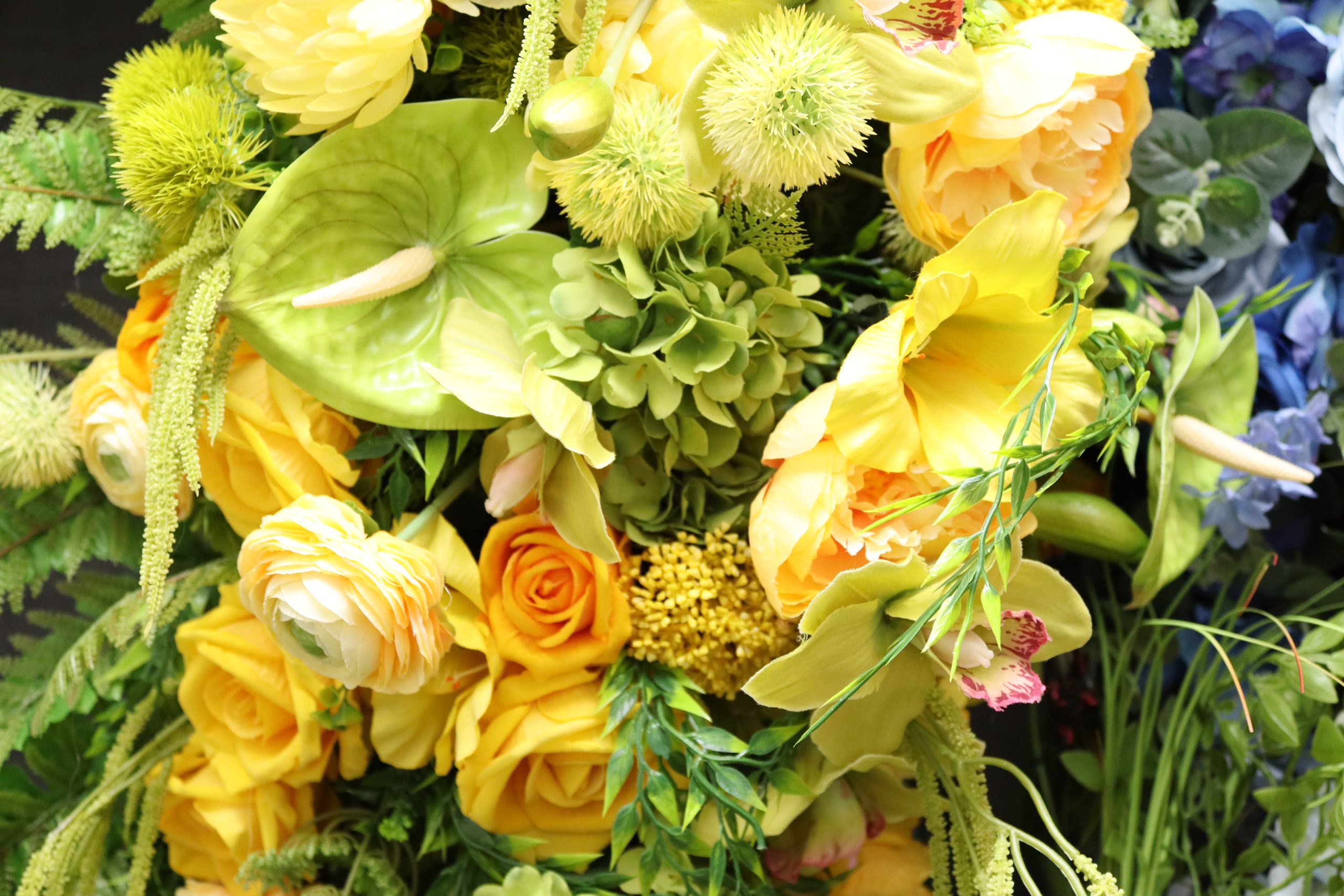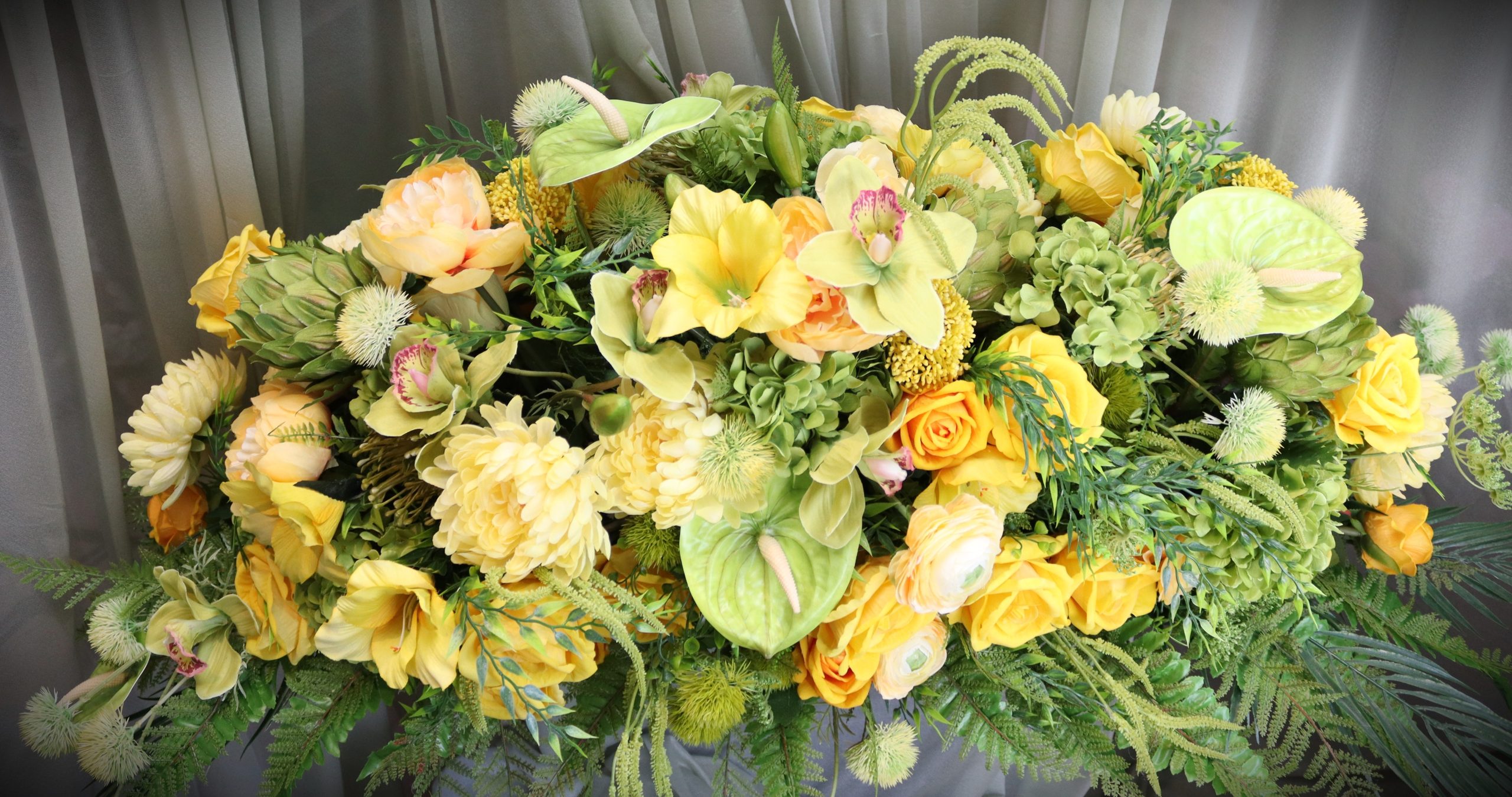 • Yellow Rose & Orchid Casket Spray – Cheerful blend of yellow roses, green orchids, dahlias, pampas grass, willow, and pineapple flowers.