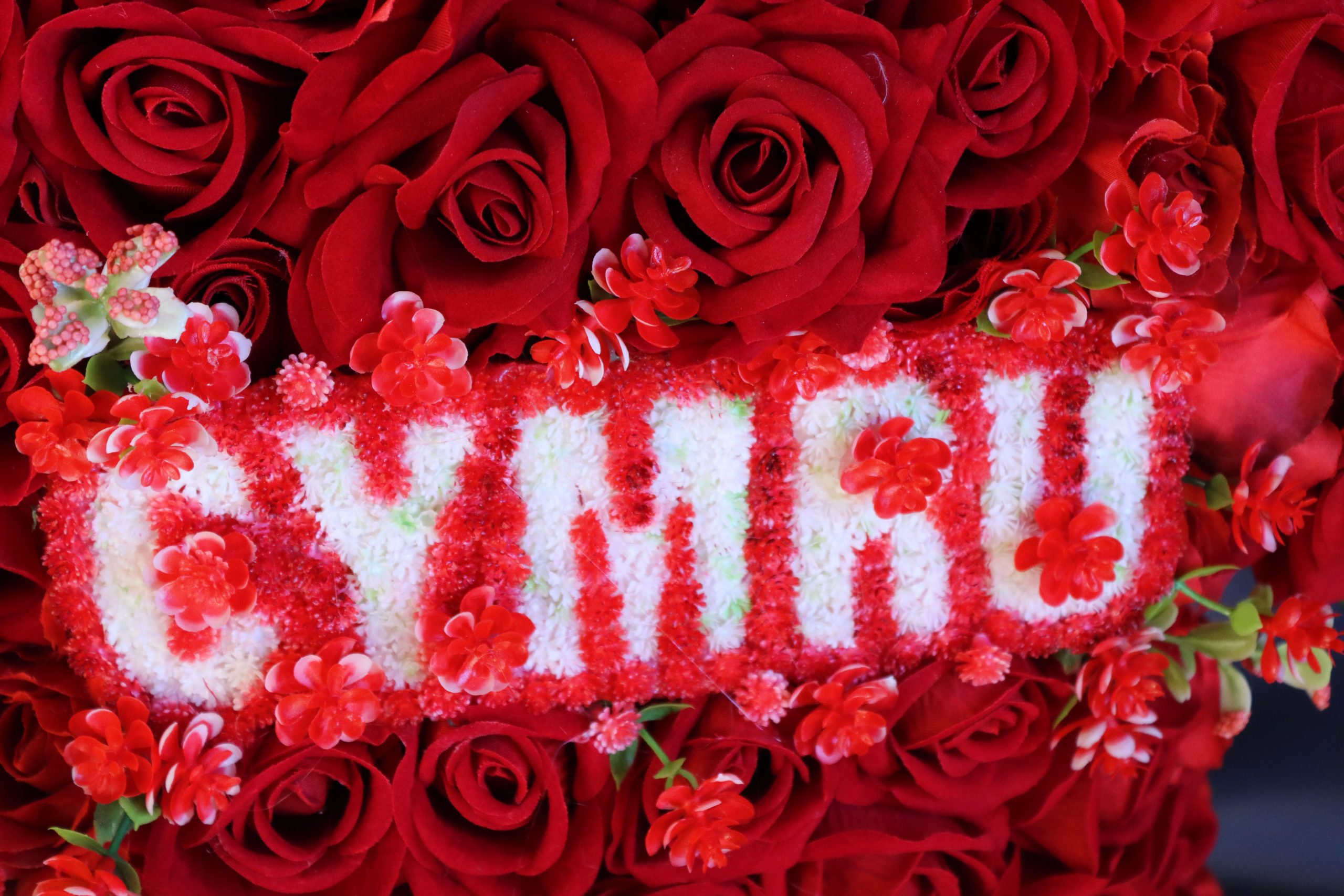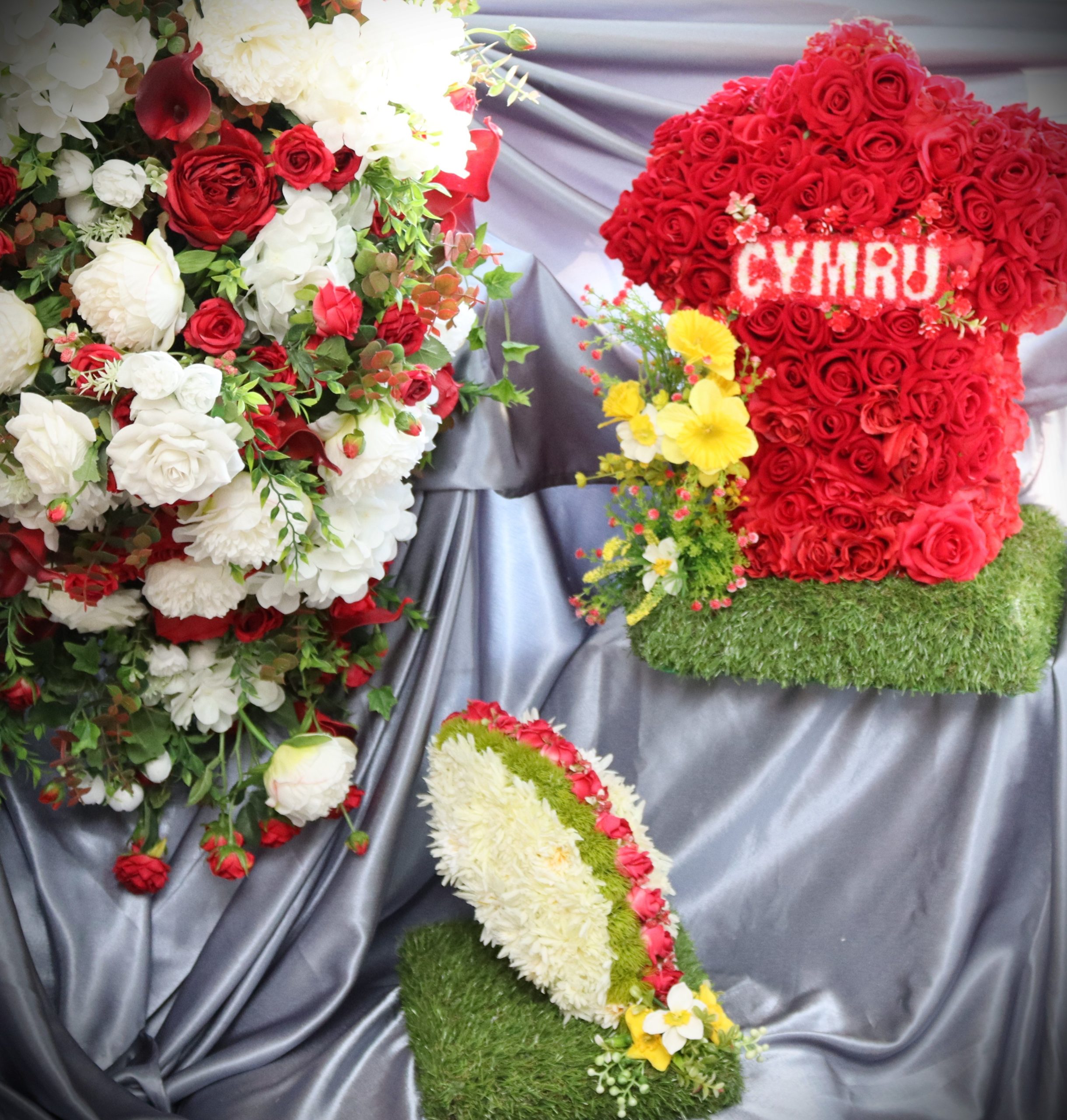 This meaningful tribute features a rugby ball and a Wymru rugby shirt, accompanied by a stunning red and white rose calla lily casket spray — representing love, strength, and peace.