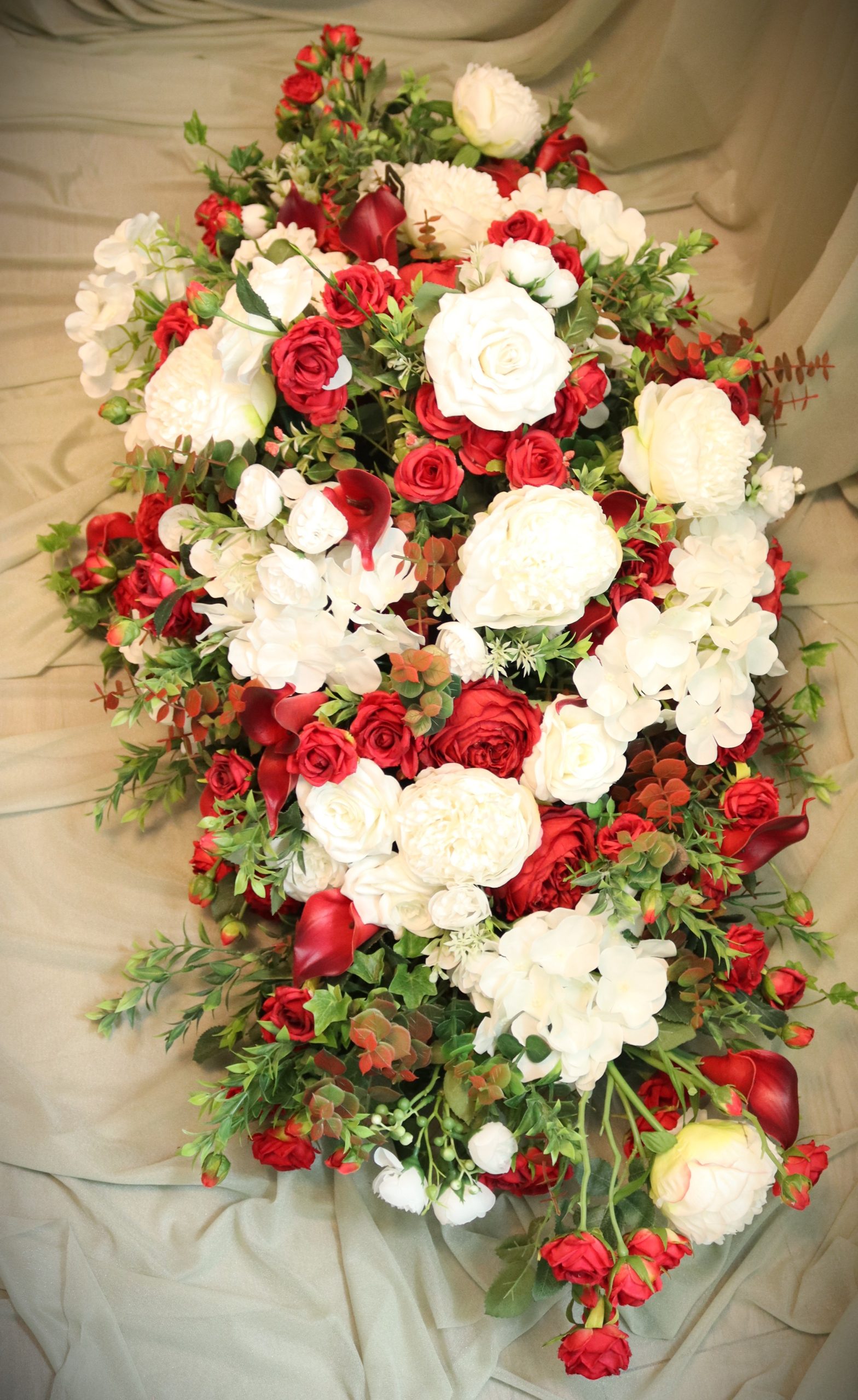 This meaningful tribute features a rugby ball and a Welsh rugby shirt, accompanied by a stunning red and white rose calla lily casket spray — representing love, strength, and peace.